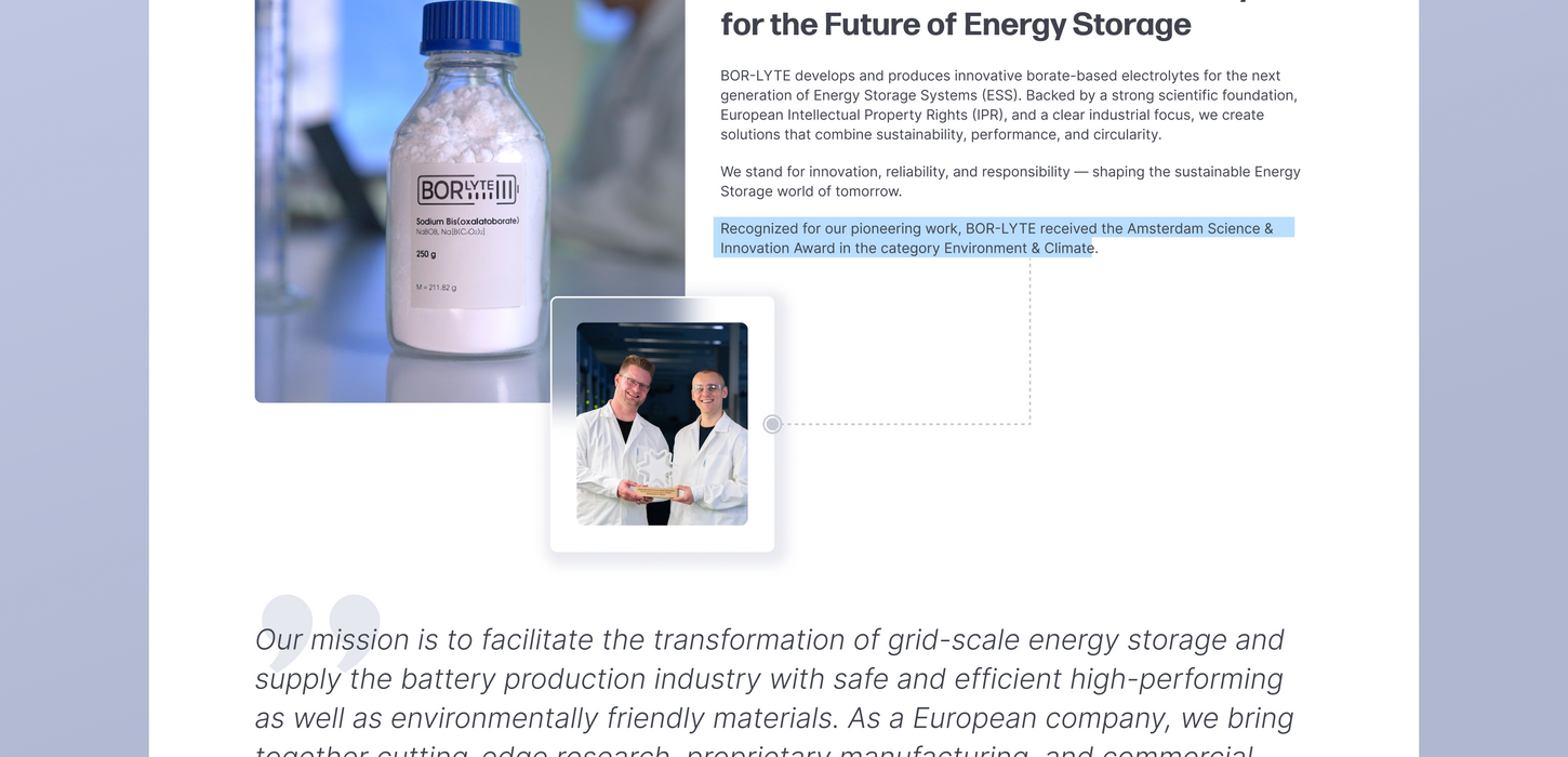 Bor‑Lyte is a Dutch company developing boron‑based energy storage solutions. The project focused on creating a clear, trustworthy website and an investor‑ready presentation that explain a highly technical product in simple terms. The goal was to help the team communicate their technology, market potential, and roadmap to partners, early customers, and investors in a way that feels both scientific and accessible